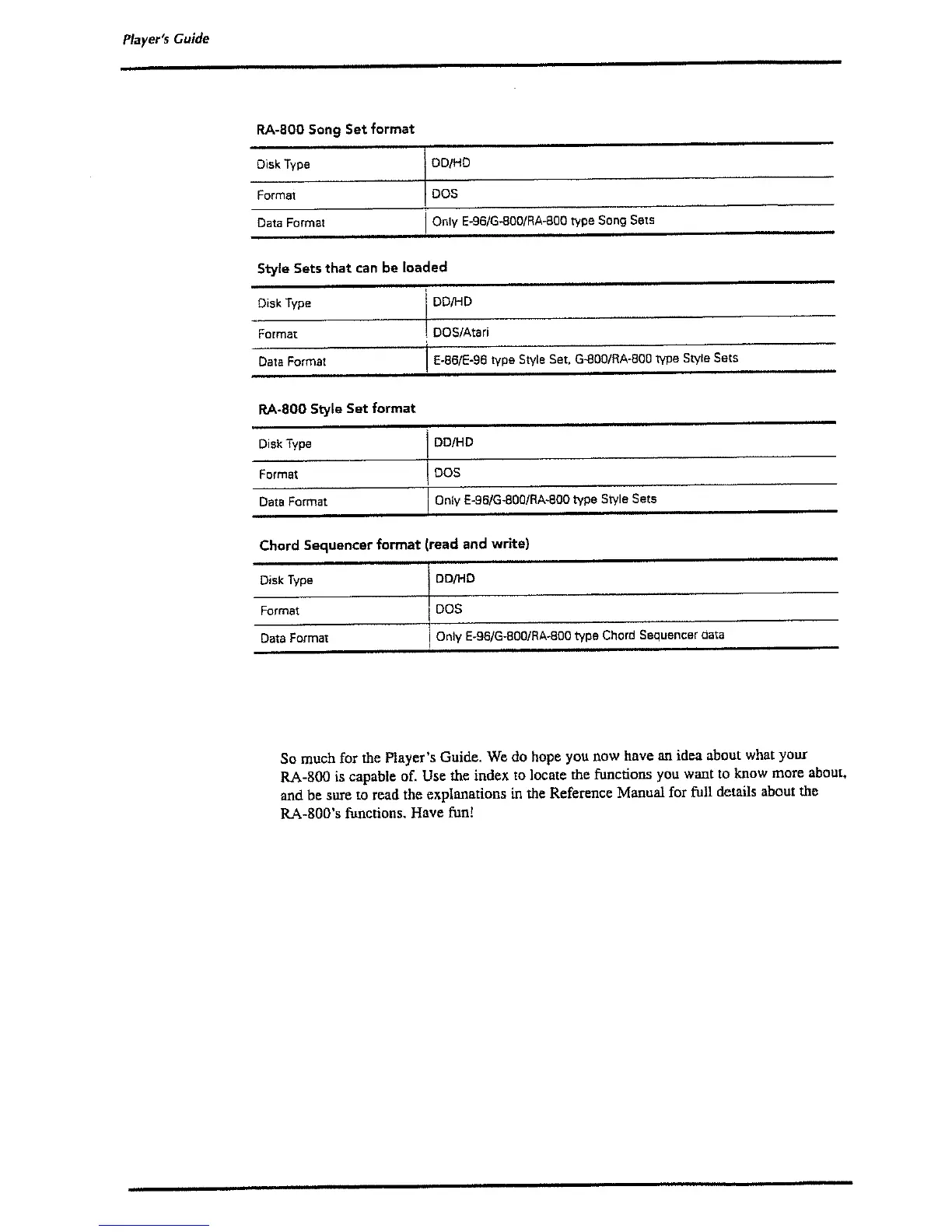 Roland RA-800 - Song Set Format; Style Sets that Can be Loaded; Style Set Format; Chord Sequencer Format - Read and Write