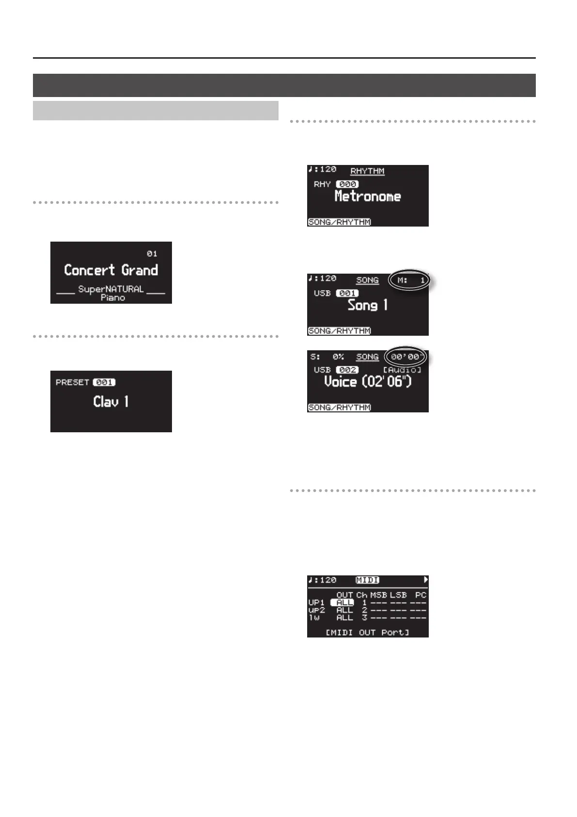 You can change Rhythm patterns, Songs, and the tempo (p. 36, p. 37).