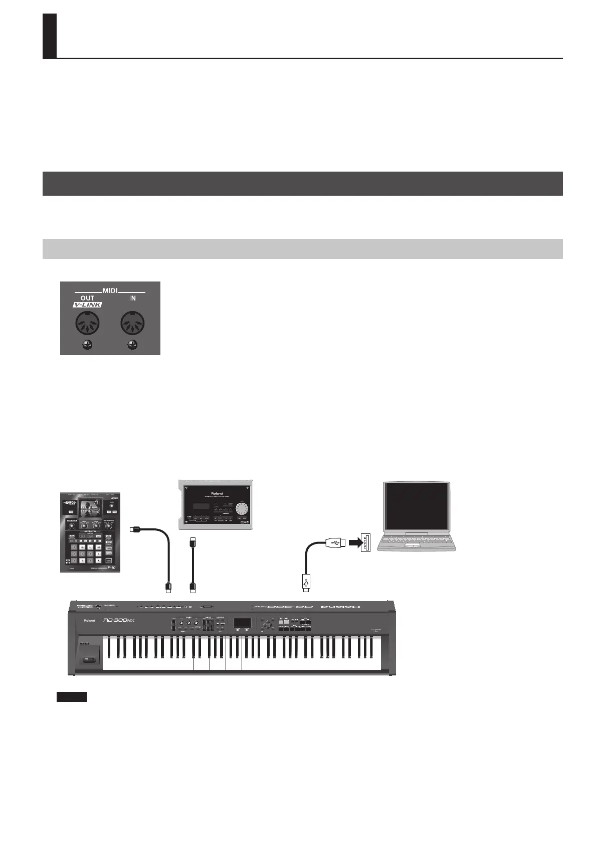 MIDI messages are transmitted from these connectors to external MIDI devices. The RD-300NX’s MIDI OUT connectors are used for sending the