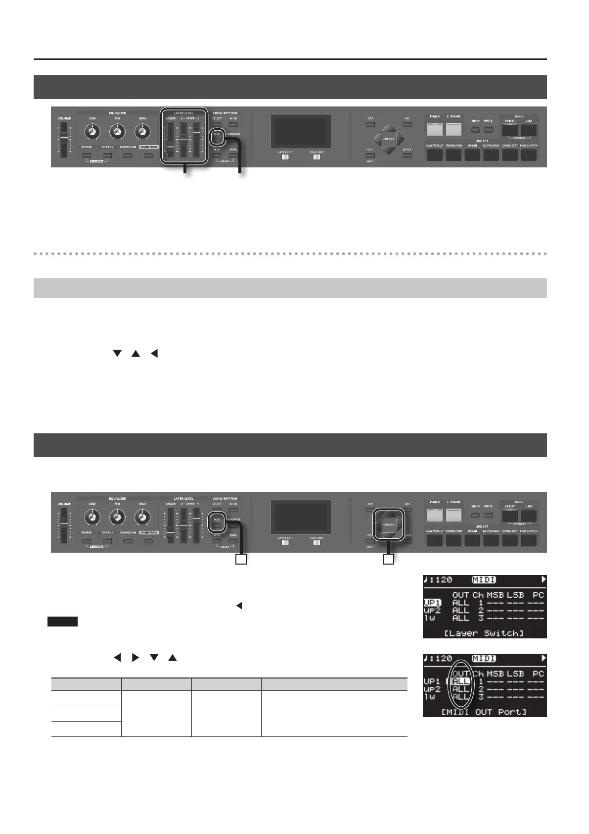 For each layer you can select the MIDI OUT connector or USB MIDI connector from which its data is to be transmitted.