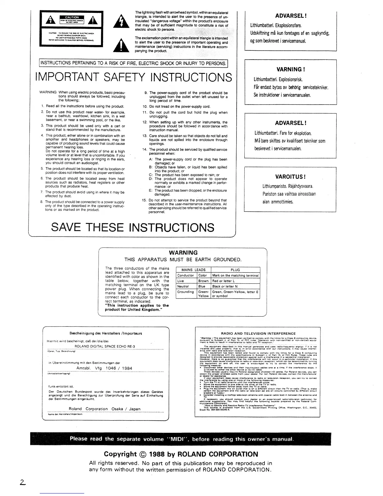 Roland RE-3 - Safety Instructions; Radio and Televison Interference