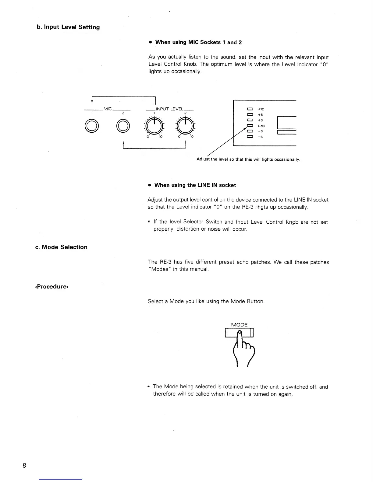 Roland RE-3 - Input Level Setting; Mode Selection; When Using MIC Sockets 1 and 2; When You Use the Line in Socket