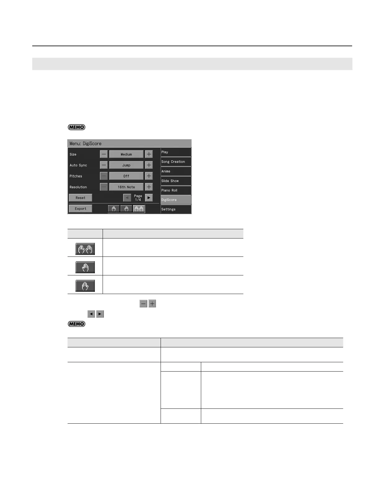 You can select the parts to be displayed in the notation by touching the three icons at the lower left of the screen.