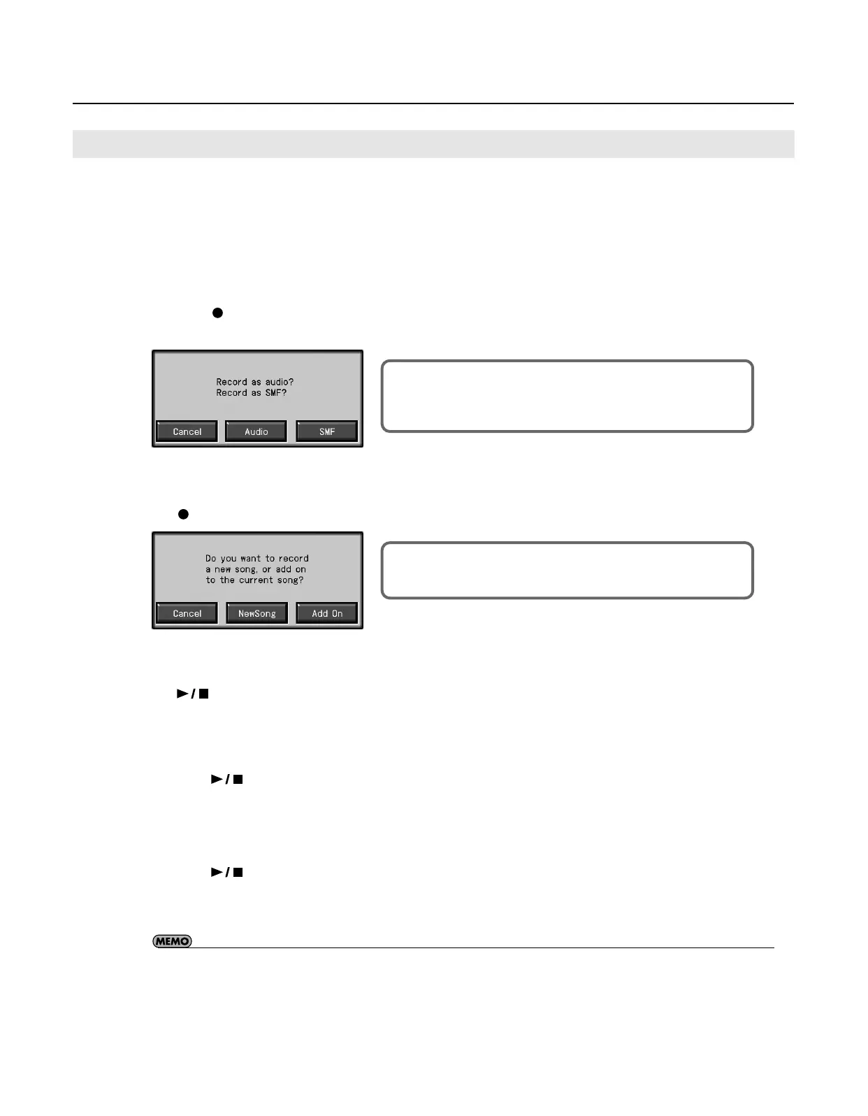 • The song tempo is stored within the song you selected. If you want to change the tempo of the recorded song, refer to “Changing