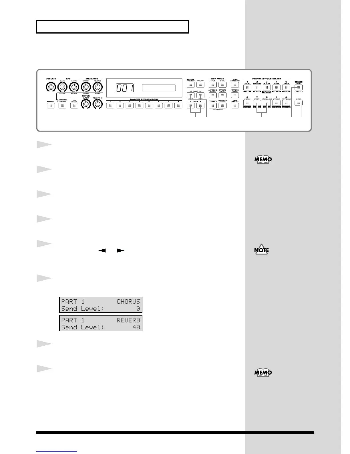 Set the chorus or reverb to ON (refer to previous section).
