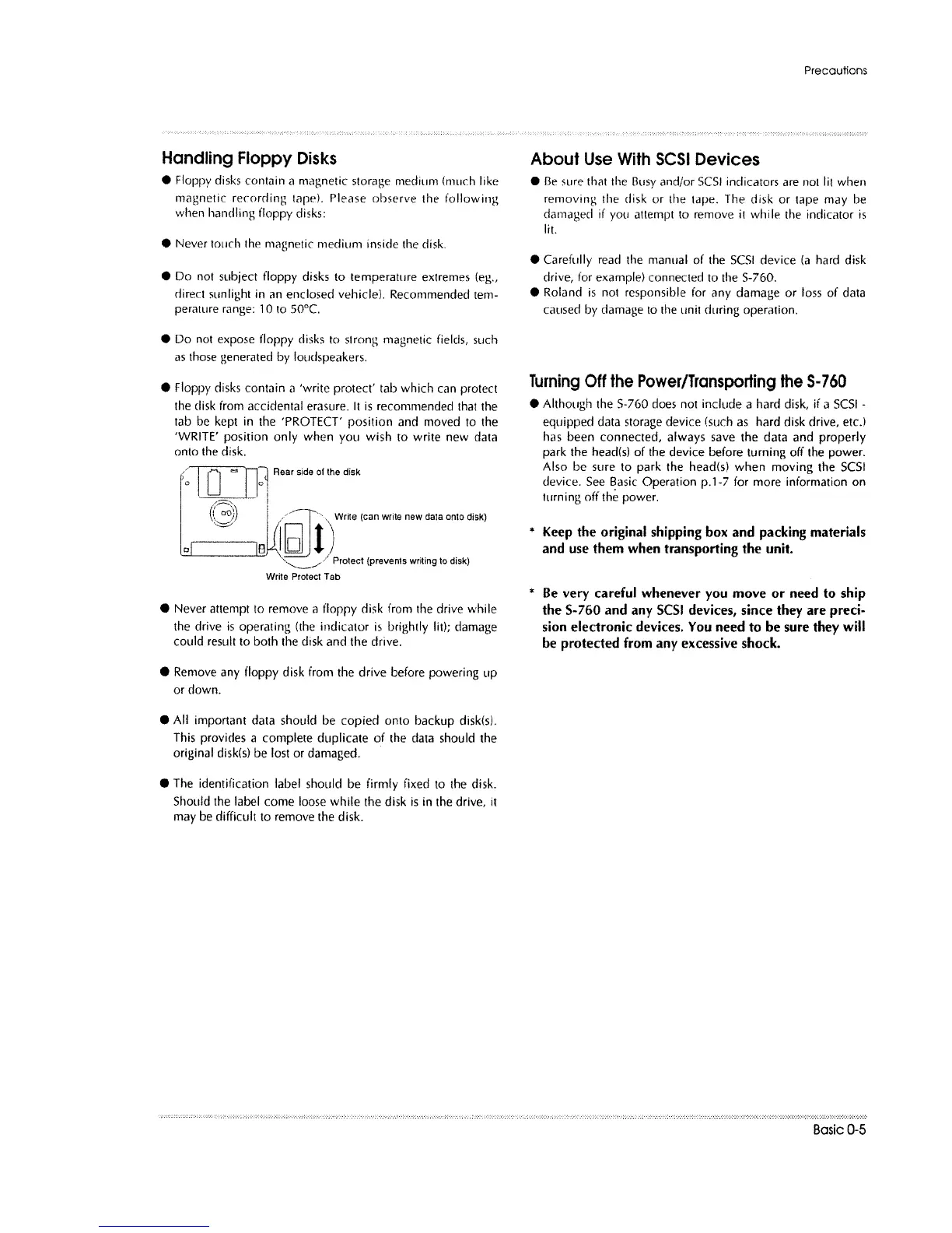 Roland S-760 - Handling Floppy Disks; About Use with SCSI Devices; Turning off the Power;Transporting the Unit