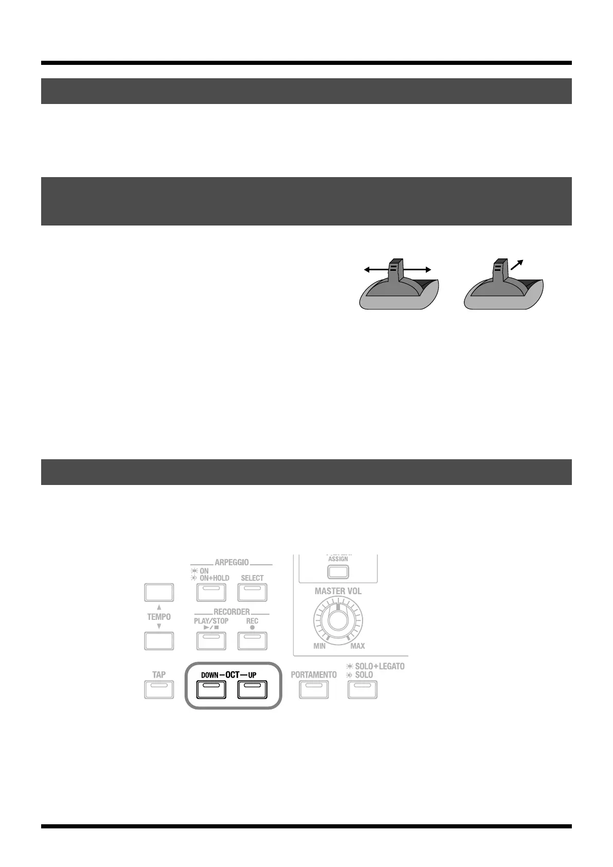 • Press the OCT DOWN button to shift the pitch downward. Each press shifts the keyboard one octave downward.