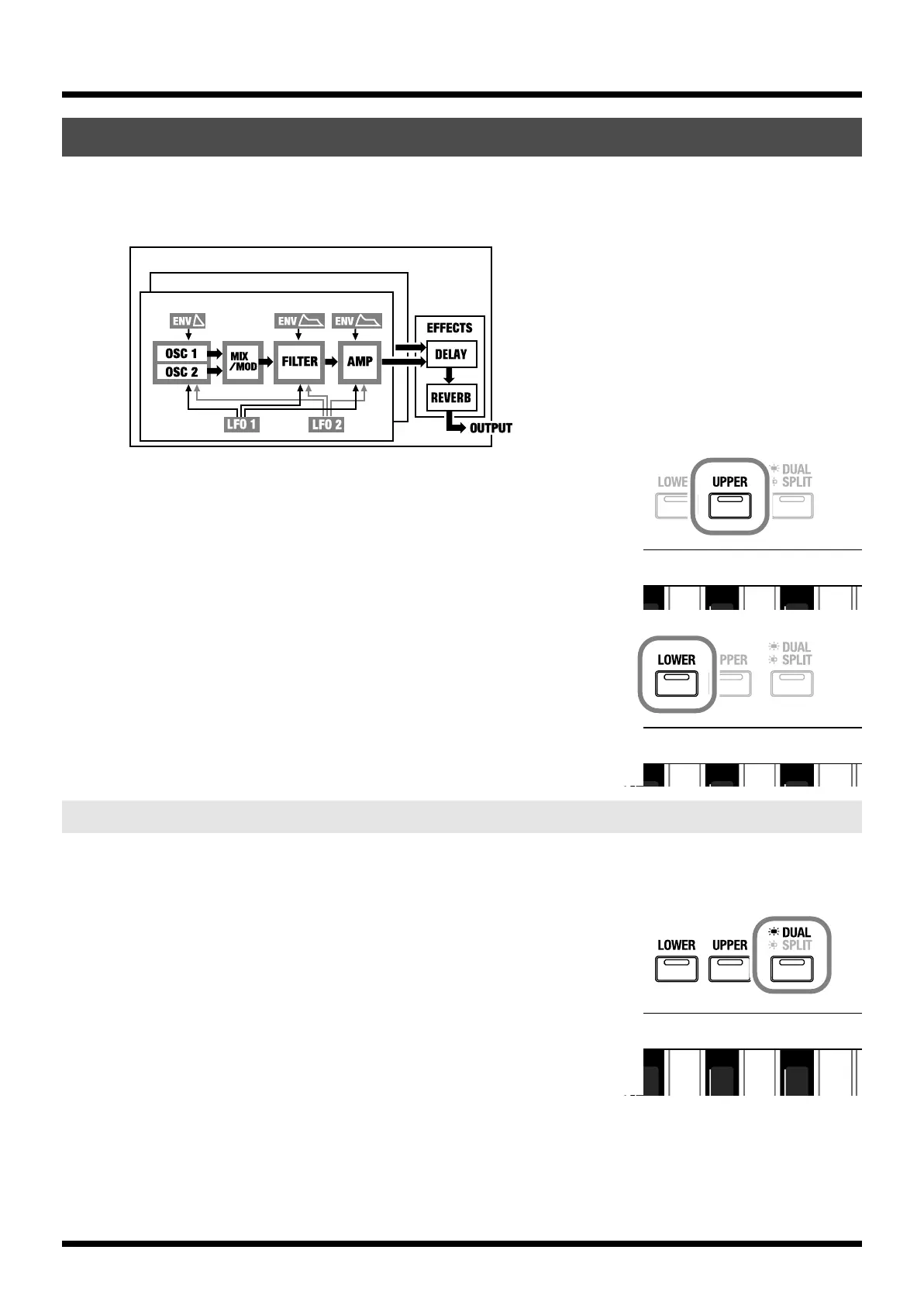 When you play the keyboard, the UPPER tone and LOWER tone will sound