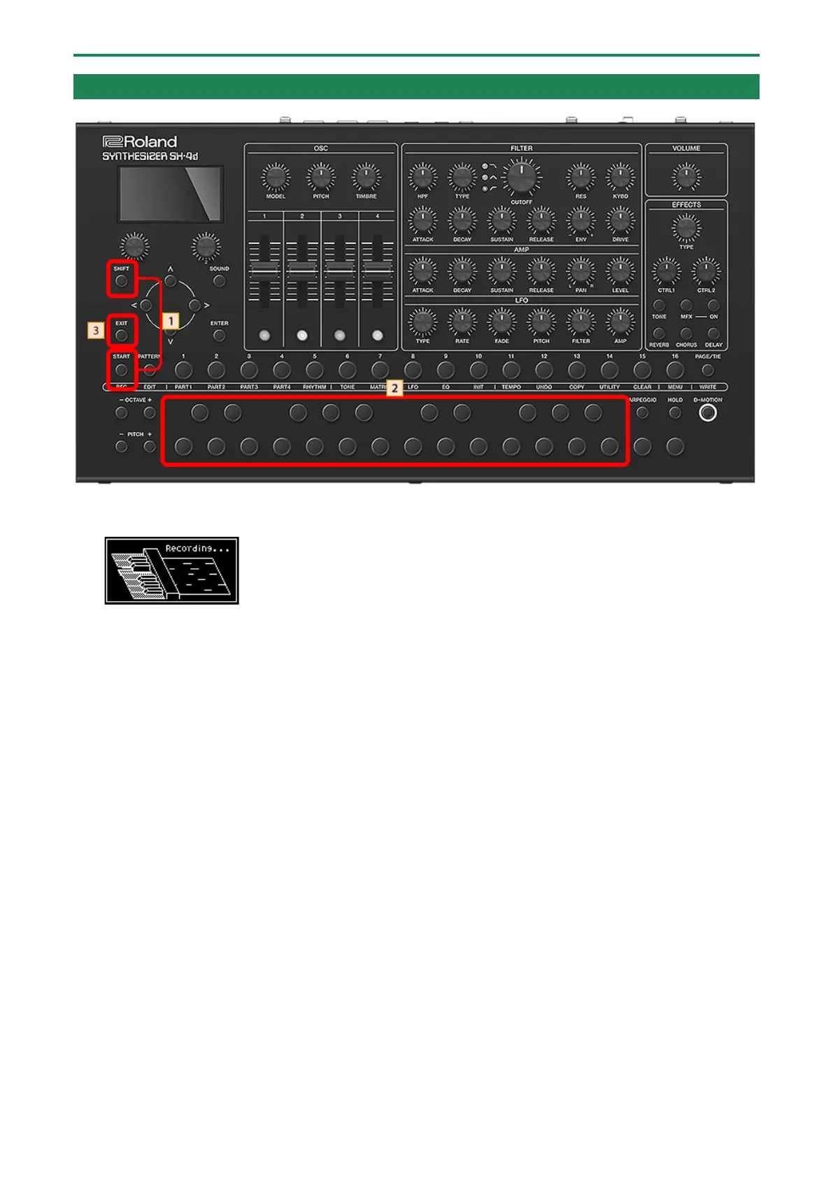 The unit enters real-time input mode, and “Recording” appears on the display.