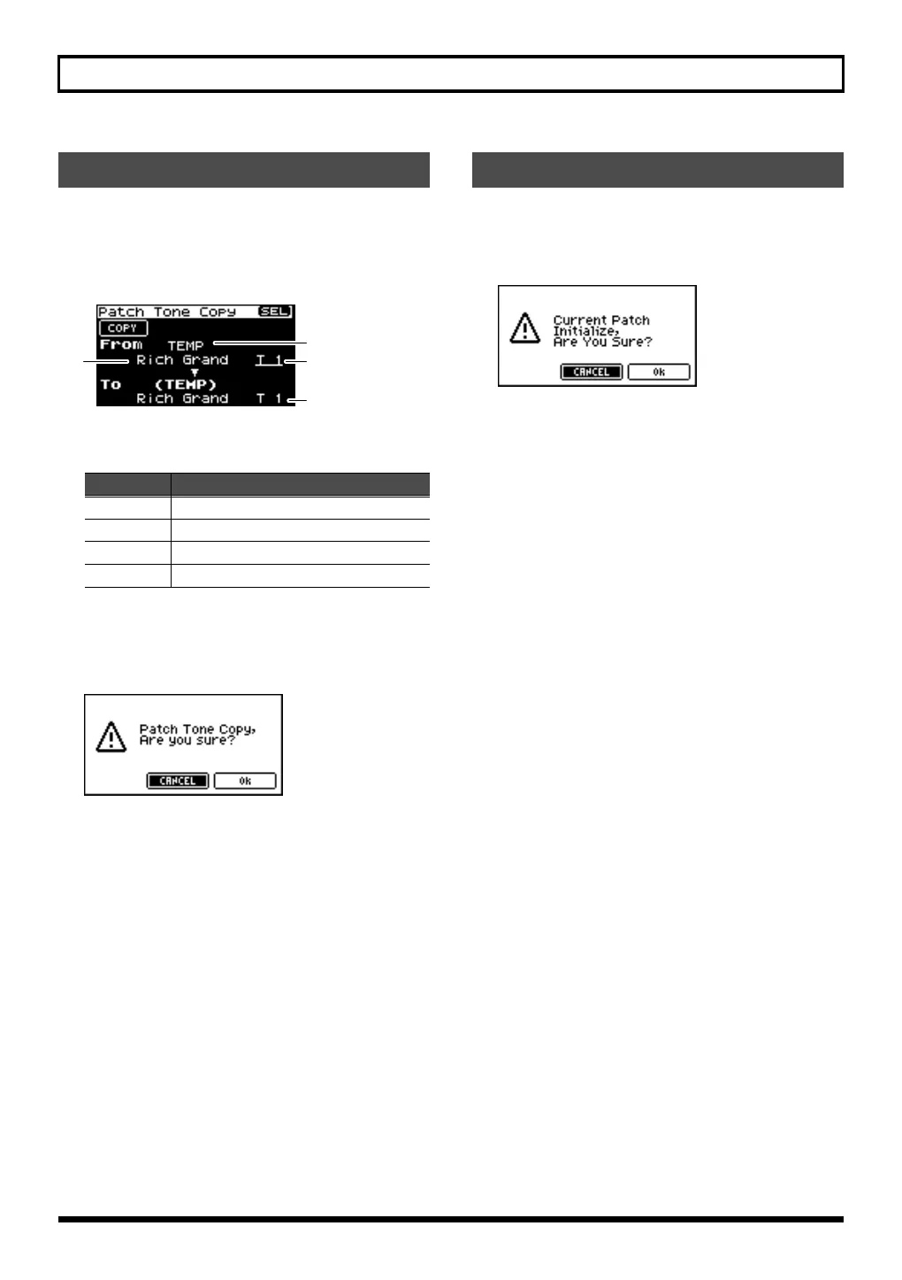 From the Patch Edit menu screen (p. 88), select “Tone Copy.”