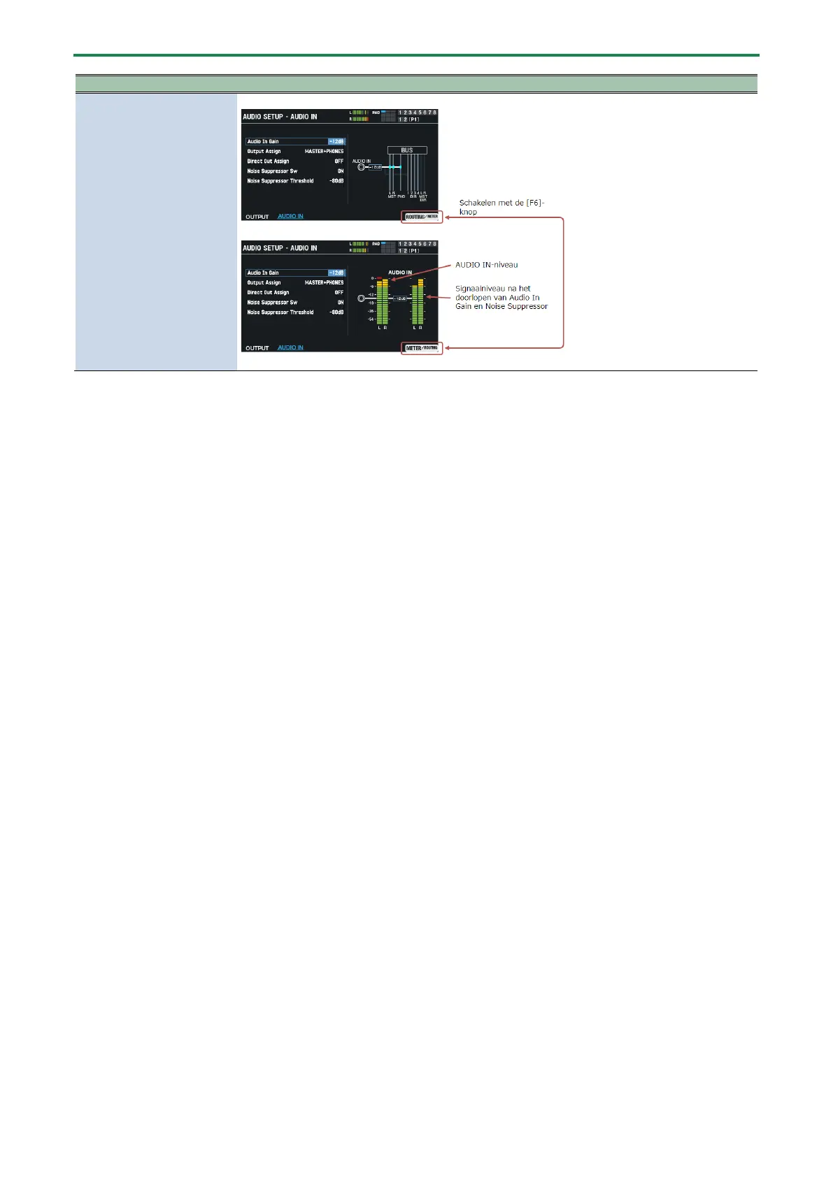 Schakelt tussen de routingweergave van de AUDIO IN-aansluiting en de niveaumeterweergave.