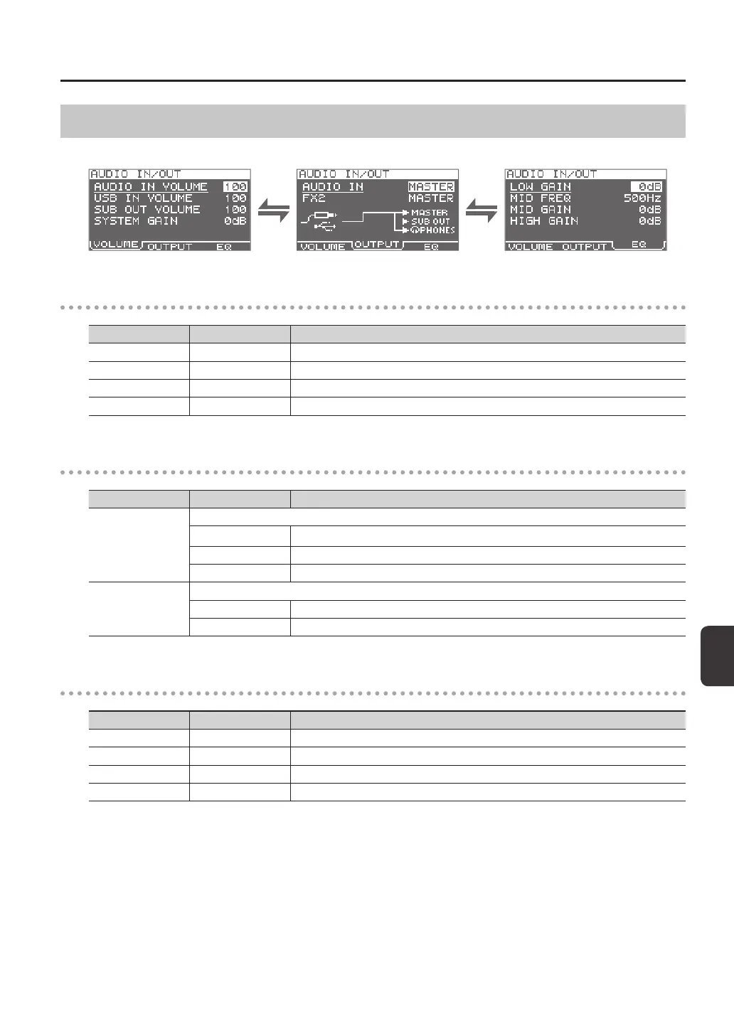 AUDIO IN VOLUME 0–100 Adjusts the volume of the input to the AUDIO IN jacks.