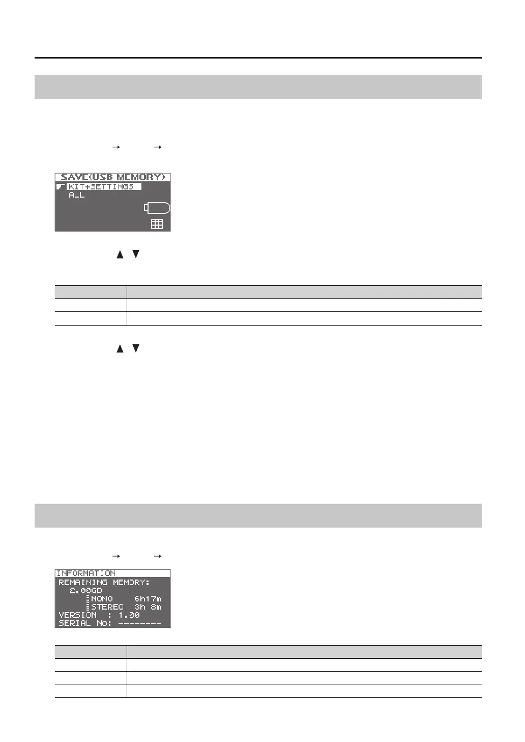 Here you can view information about the SPD-SX itself, such as the remaining amount of internal memory.