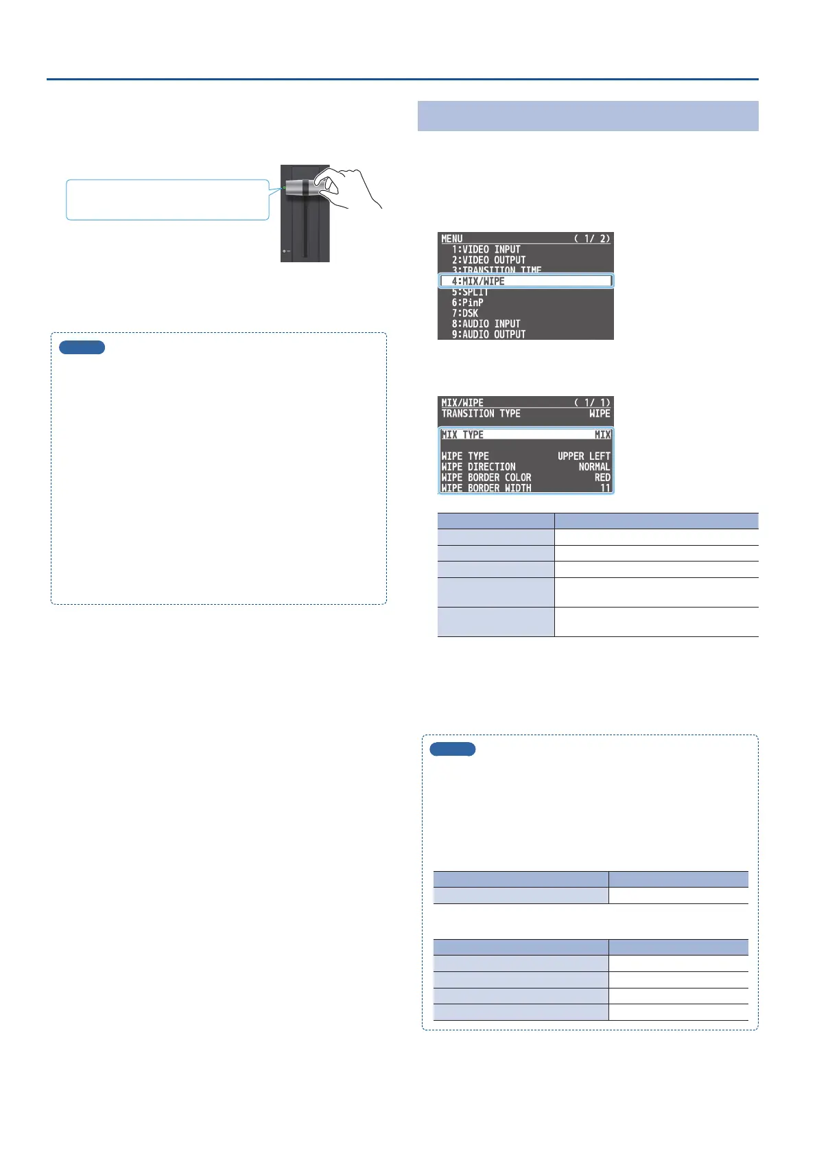You can change the settings of the MIX/WIPE menu by holding