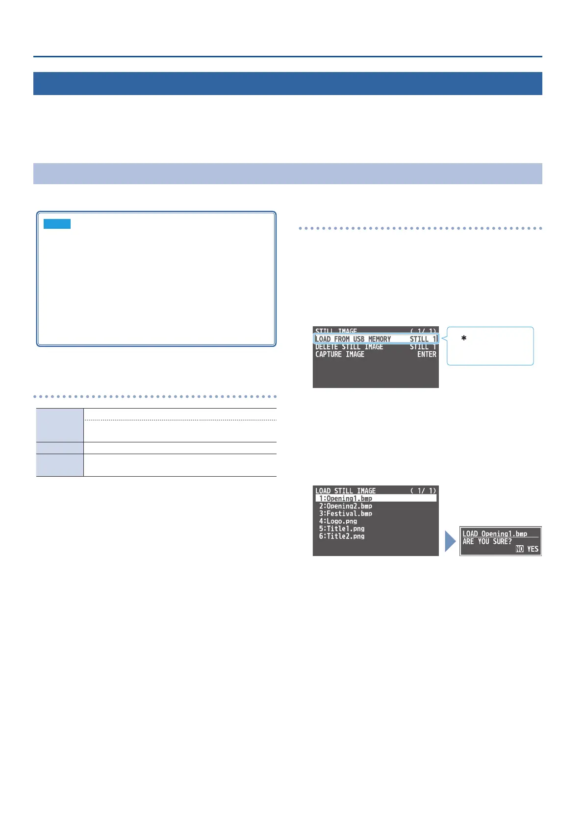 You can load a still image, and output it in the same way as video (p. 22) or use it as a source for DSK compositing (p. 29). There are two ways to