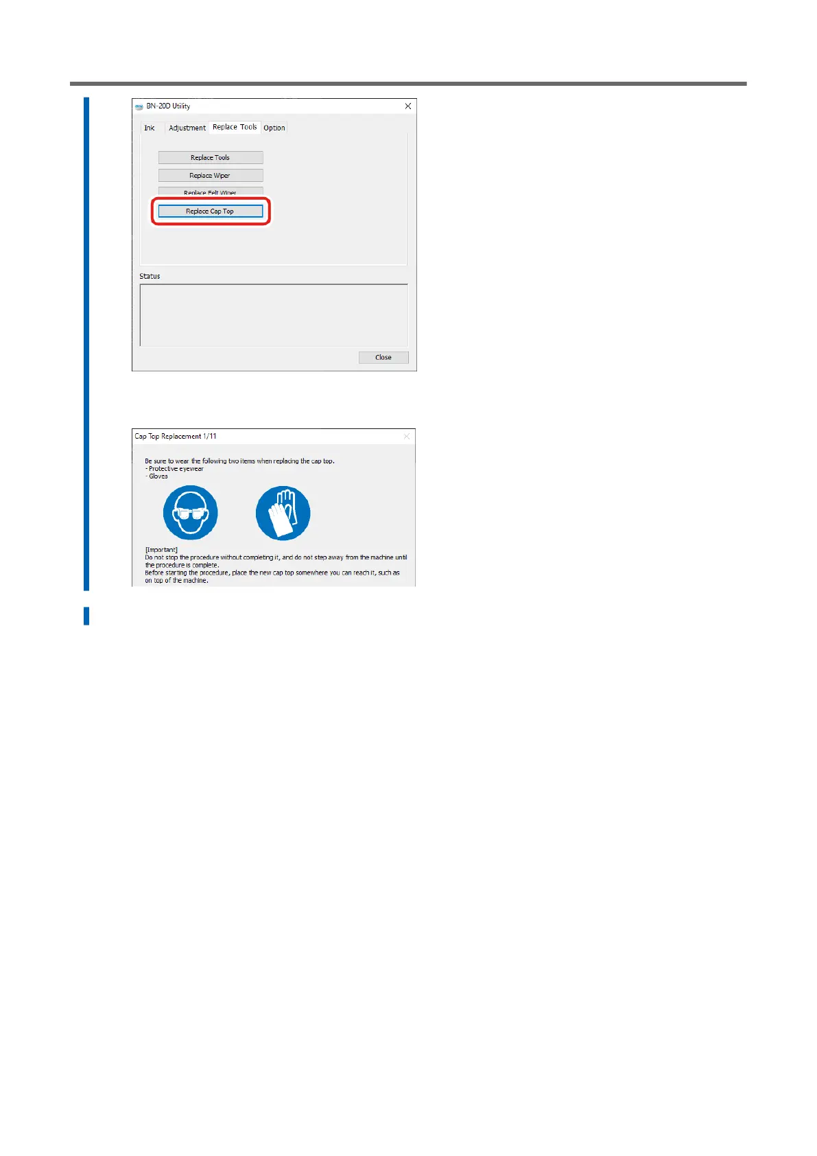 A procedure for replacing the cap top is displayed. Carefully read the on-screen instructions and