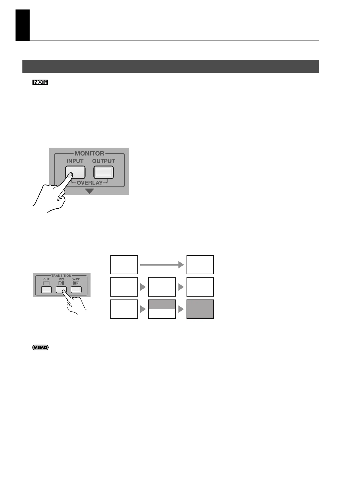 Use the [TRANSITION] buttons to select a transition effect. When you are selecting [CUT], the switch is instantaneous, and no