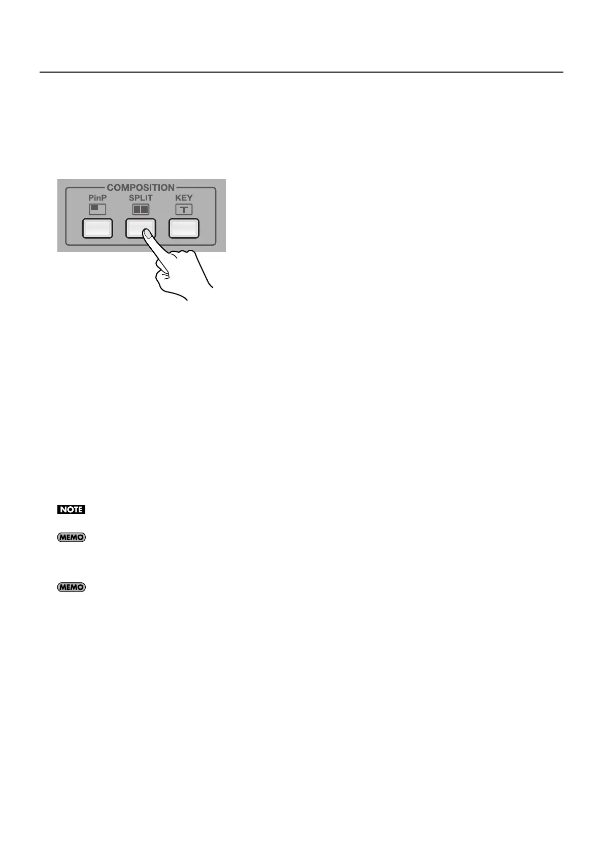 Go to [COMPOSITION] and press the [SPLIT] button to make it light up. [VIDEO SELECT] buttons [1] through [4] all simultaneously