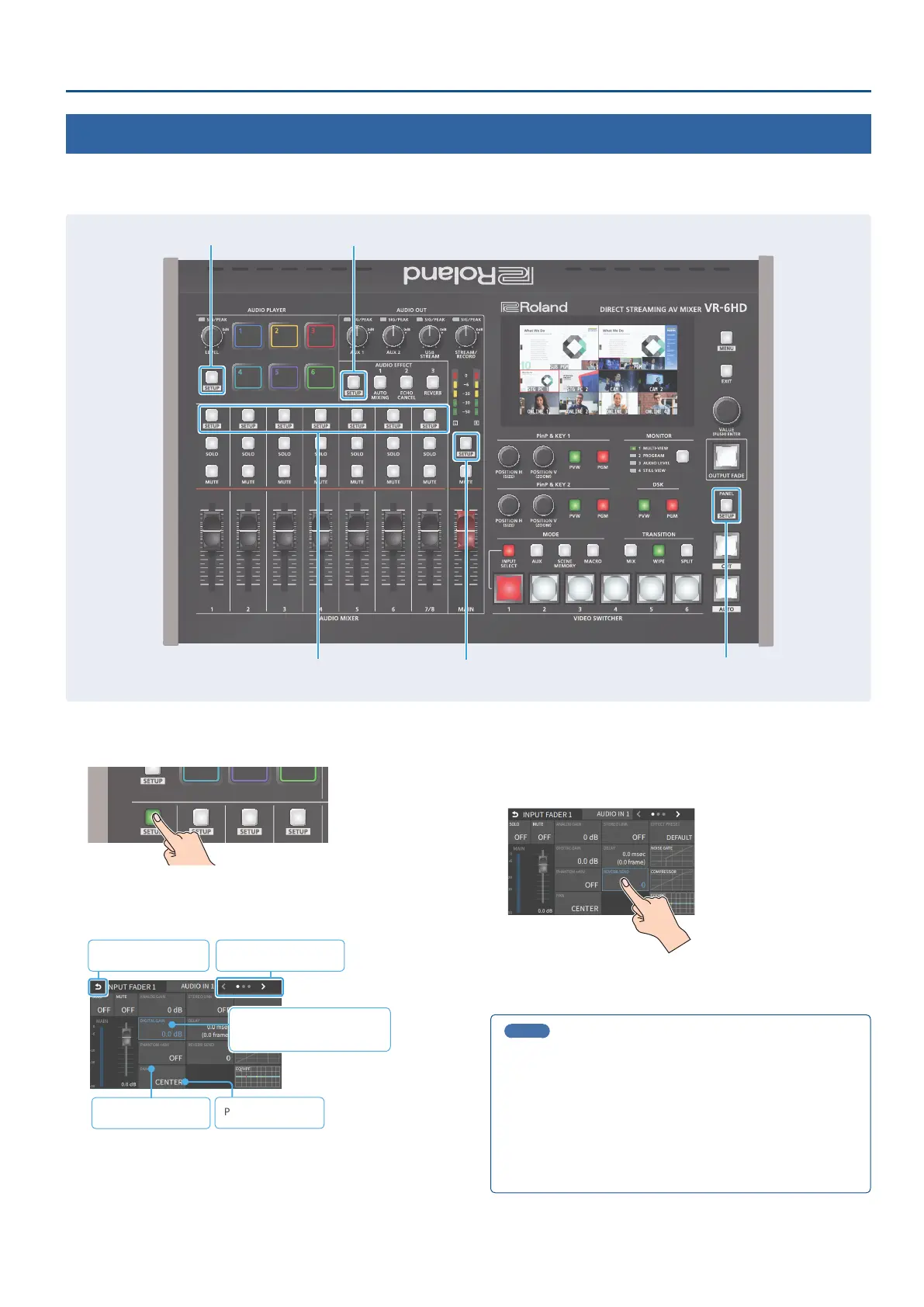 The VR-6HD features a [SETUP] button for each section. Press the respective [SETUP] button to view the setup screen for that section, and use the touch