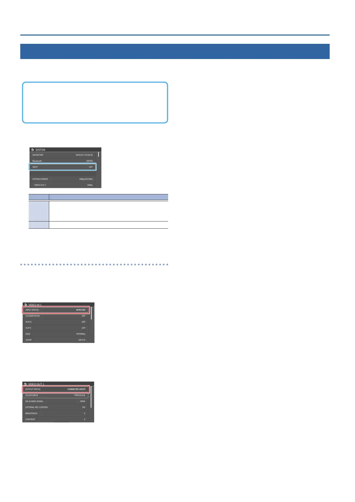 “OUTPUT STATUS” when you press the [MENU] button and select “VIDEO”