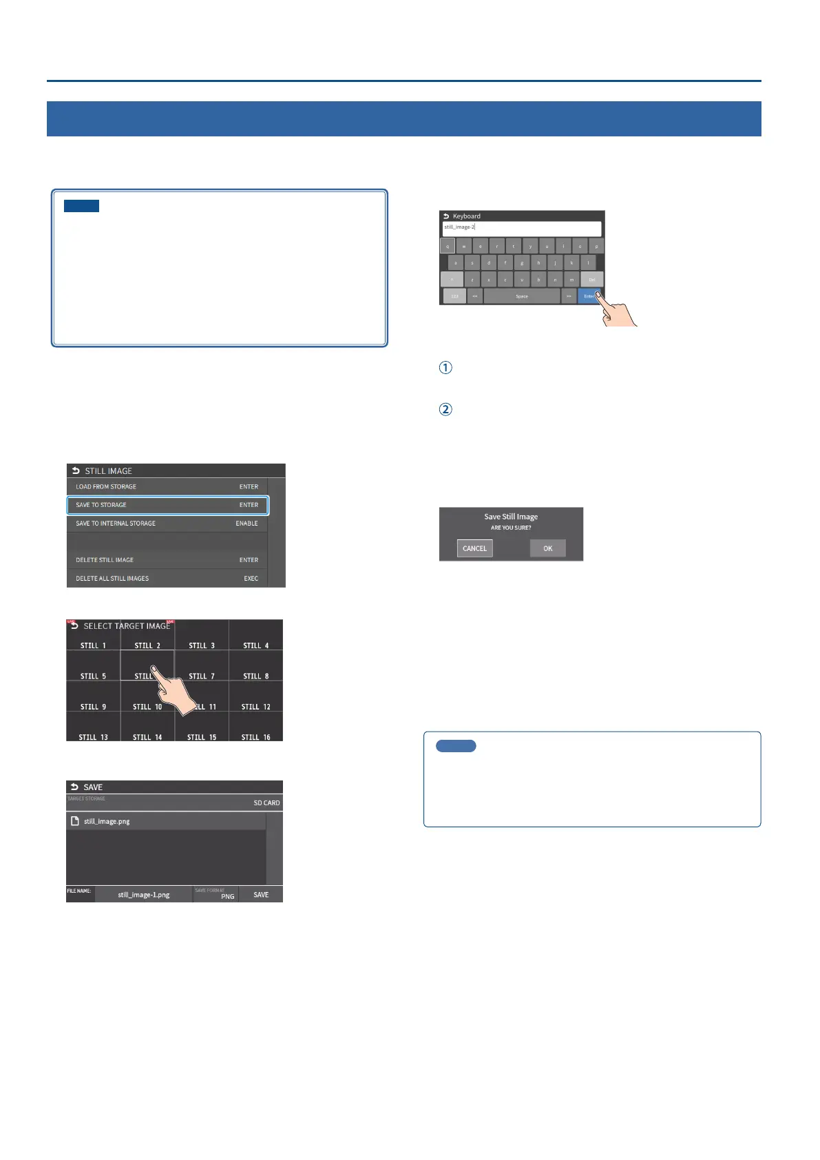 Here’s how a still image captured from the input/output video (p. 26) can be saved to a storage (SD card or USB ash drive).