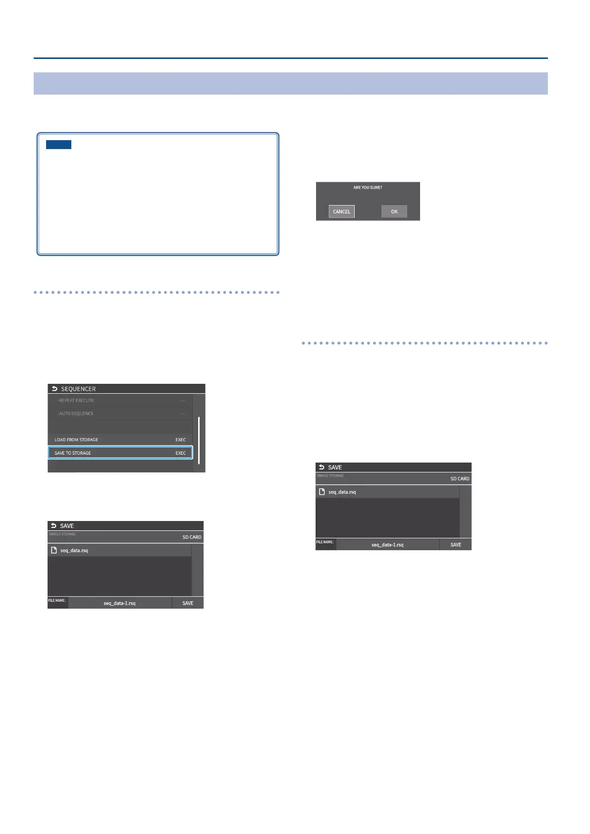 You can save the sequencer settings as a single le (.RSQ) to a storage (SD card, USB ash drive) connected to the VR-6HD.