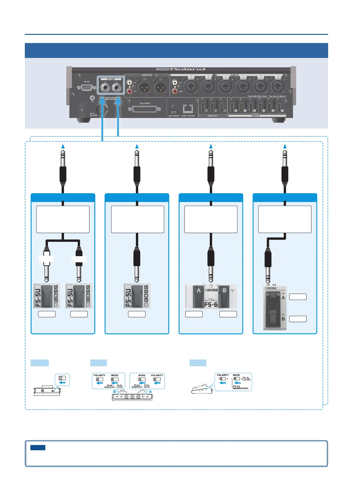 The BOSS FS-6’s A, B, and A&B jacks also act as the power switch. The power turns on when you insert a plug into the jack, and turns o when you