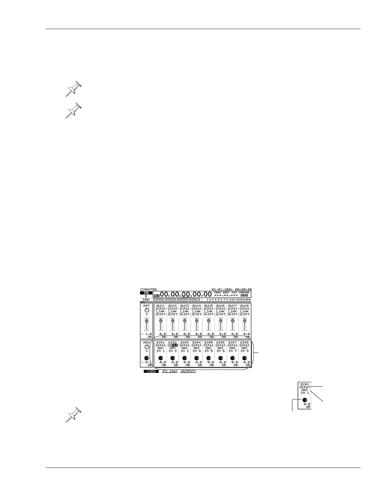VIEW screen—see Page 156. Page 229 describes sending an effect to a Direct bus.