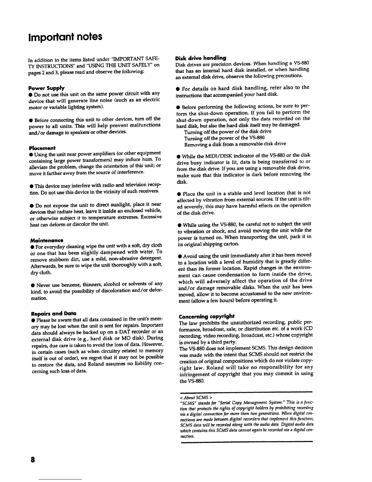 Roland VS-880 - Important Notes; Power Supply; Placement; Maintenance