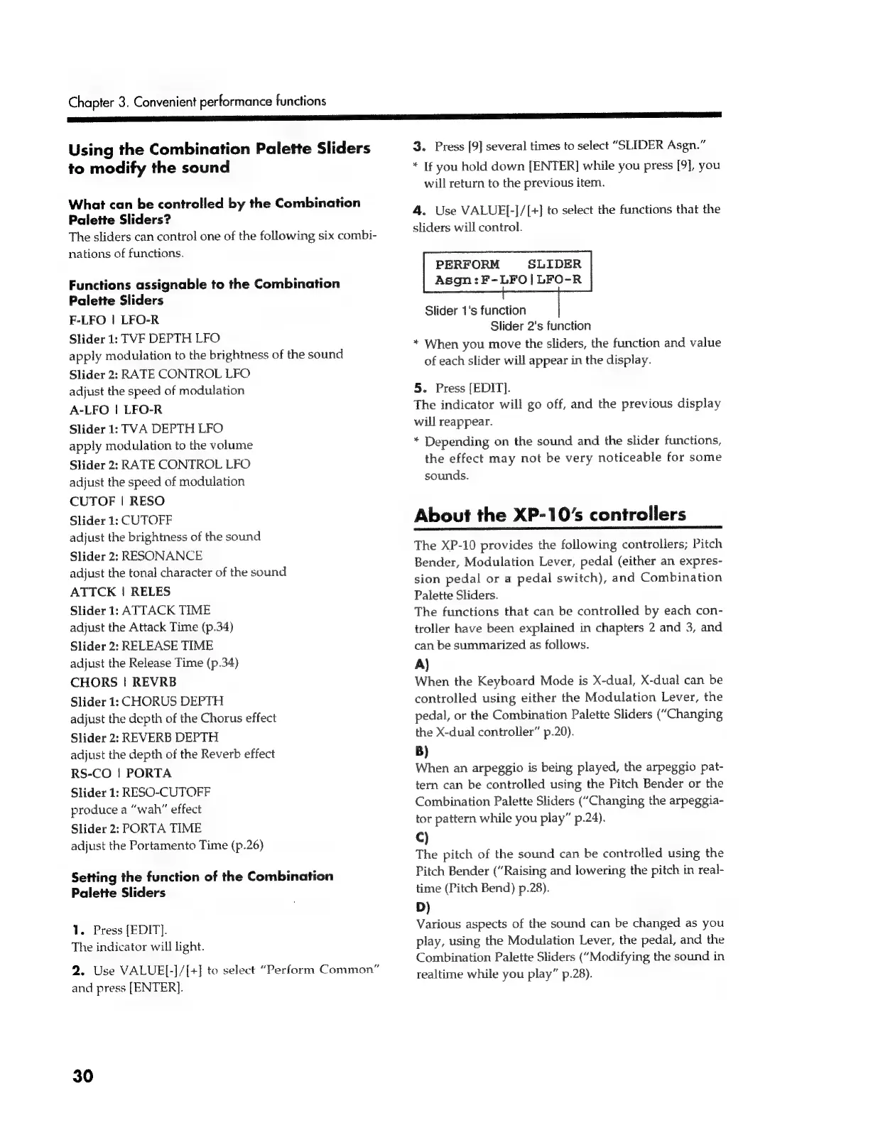 Roland XP-10 - Using the Combination Palette Sliders to Modify the Sound; What Can be Controlled by the Combination Palette Sliders; Setting the Function of the Combination Palette Sliders; About Tie AP