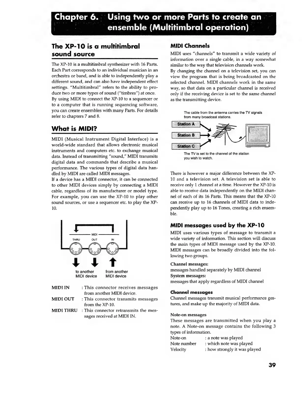 Roland XP-10 - Chapter 6. Using Two or more Parts to Create an Ensemble; The XP-10 Is a Multitimbral Sound Source; Das Wll Ep Hse Unt Wane Ea Enae Teeta Amet al Sua Oye Iaueanenopnecaaed Ene; MIDE Chaianiels Cscs Cisnc Asc, Cik Evasinistnnetint Csseealeenen el Cetl Atihticethsadouhwetunntatila Coe Avetasdgatiniubaladeeas