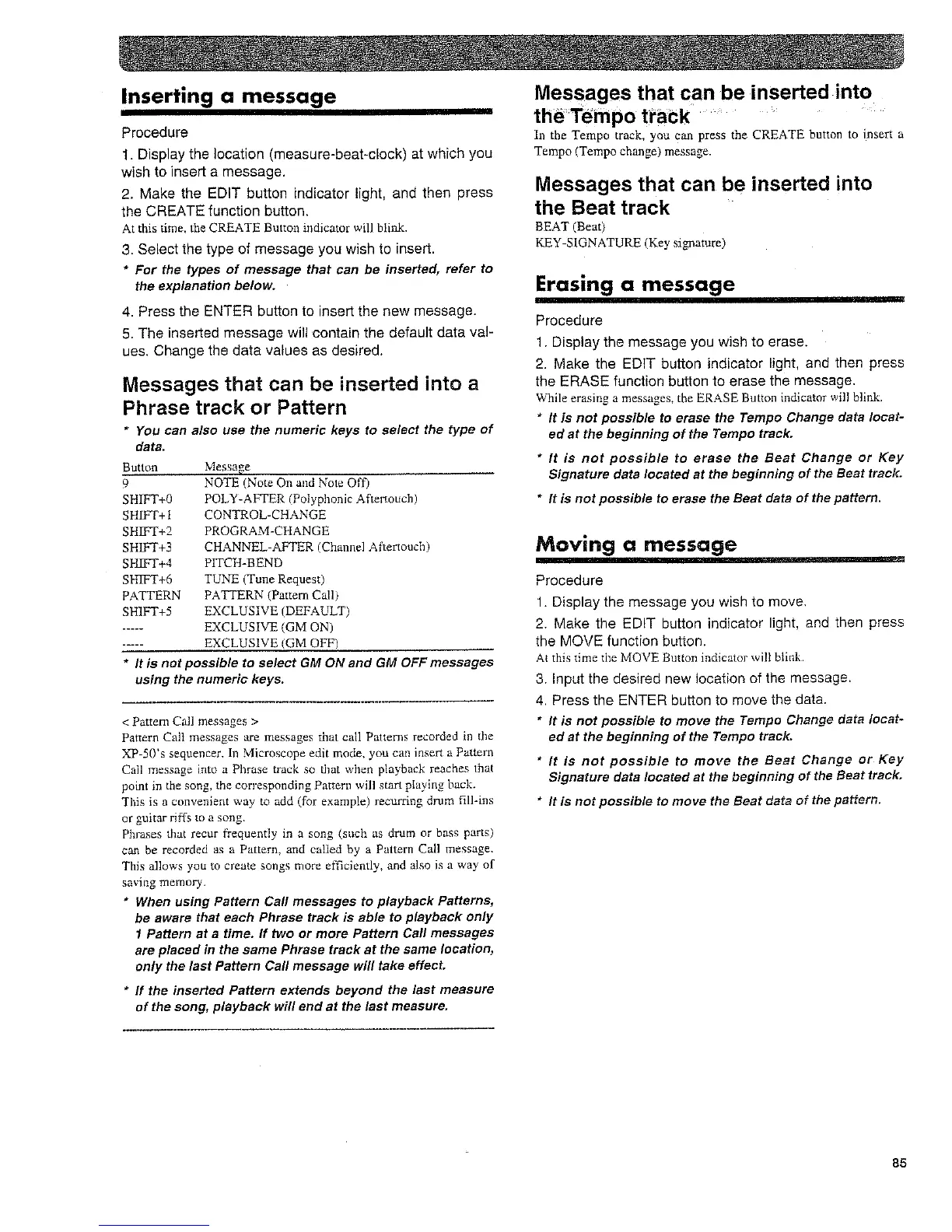 Roland XP-50 - Inserting a Message; Erasing a Message; Moving a Message; Messages that Can be Inserted into the Tempo Track