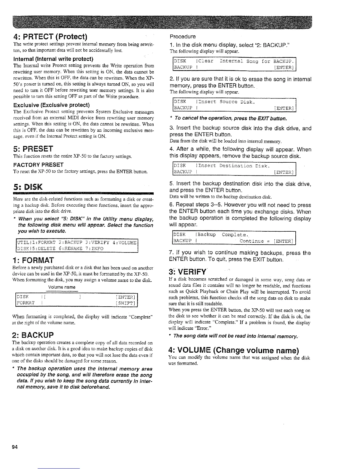 Roland XP-50 - PRTECT (Protect); Format; Backup; Verify;Volume (Change Volume Name)