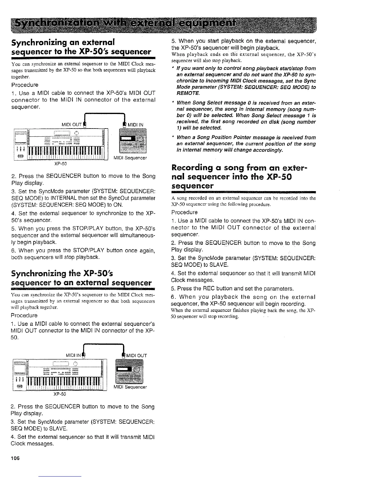 Roland XP-50 - Synchronization with External Equipment; Synchronizing an External Sequencer to the Units Sequencer; Synchronizing the Units Sequencer to an External Sequencer; Recording a Song from an External Sequencer into the Unit Sequencer