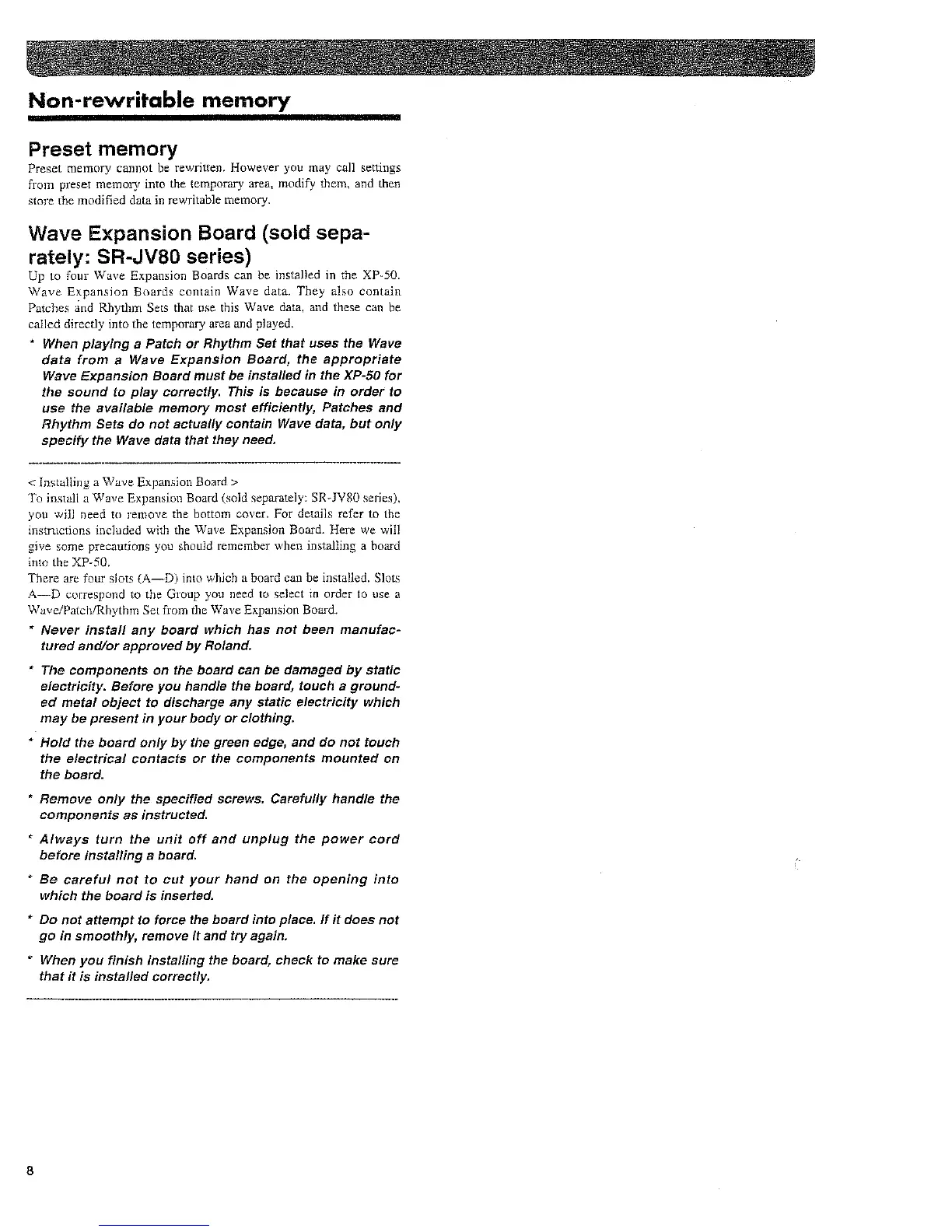 Roland XP-50 - Non-Rewritable Memory; Preset Memory; Wave Expansion Board