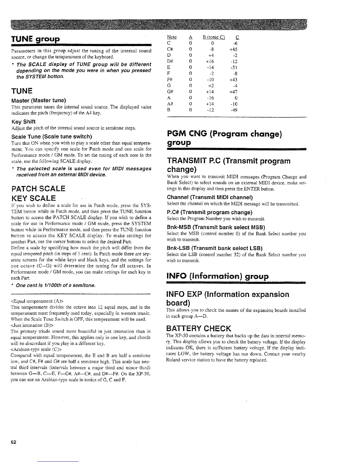 Roland XP-50 - Tune Group; PGM CNG (Program Change) Group; Transmit PC (Transmit Program Change); Battery Check