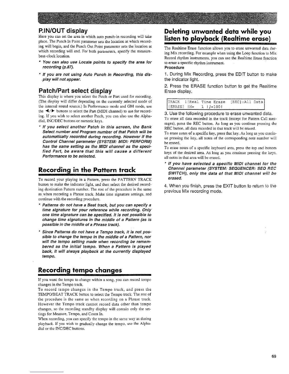 Roland XP-50 - Recording in the Pattern Track; Recording Tempo Changes; Deleting Unwanted Data While You Listen to Playback (Realtime Erase); Pin;Out Display