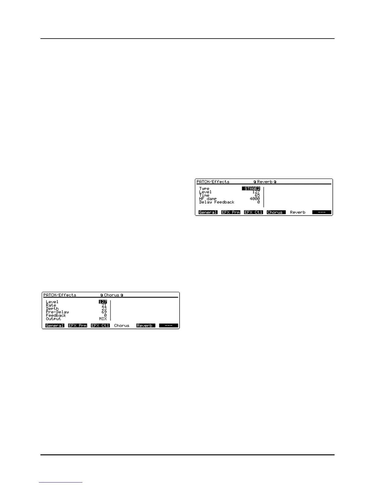 [PATCH]➞[F6] (Effects)➞[F4] (Chorus)/[F5] (Reverb)