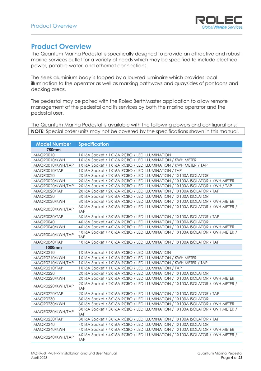 The Quantum Marina Pedestal is available with the following powers and configurations: