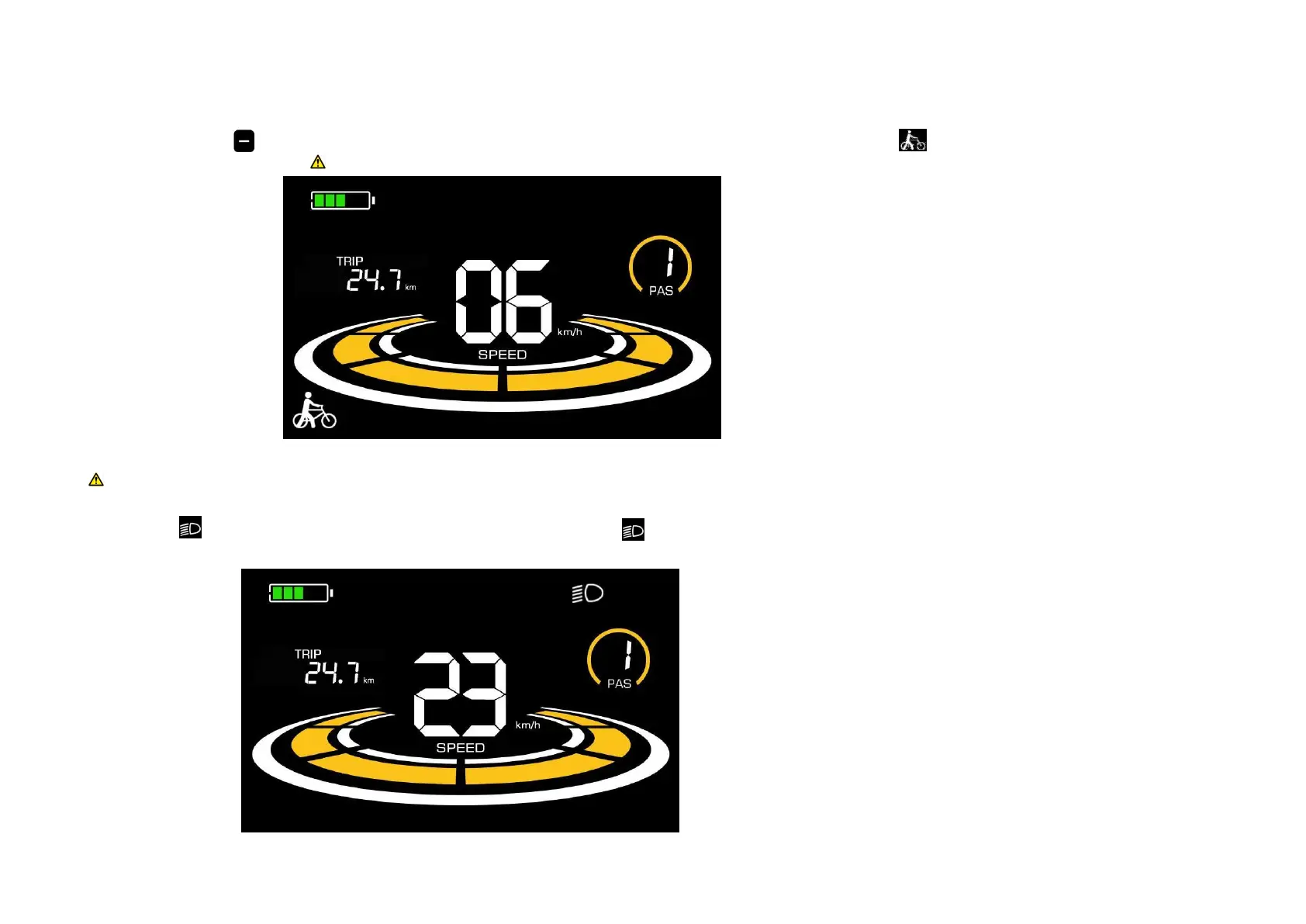 Long Press and hold , the electric bicycle enters the walk boost mode. The electric bicycle will walk at a fixed speedof 6 km per hour and the display shows . Release the button to stop the power output immediately