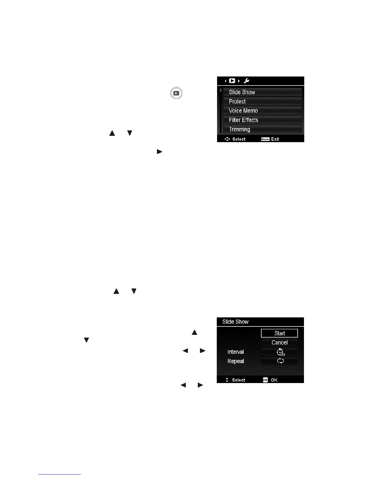 1. From the Playback menu, select Slide Show. The Slide Show menu appears.