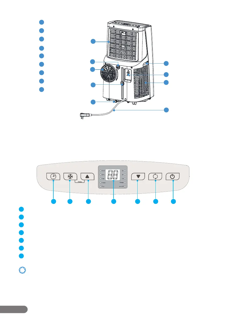 Mode Button: Press to cycle between cool, dehumidify, fan, and heat modes.