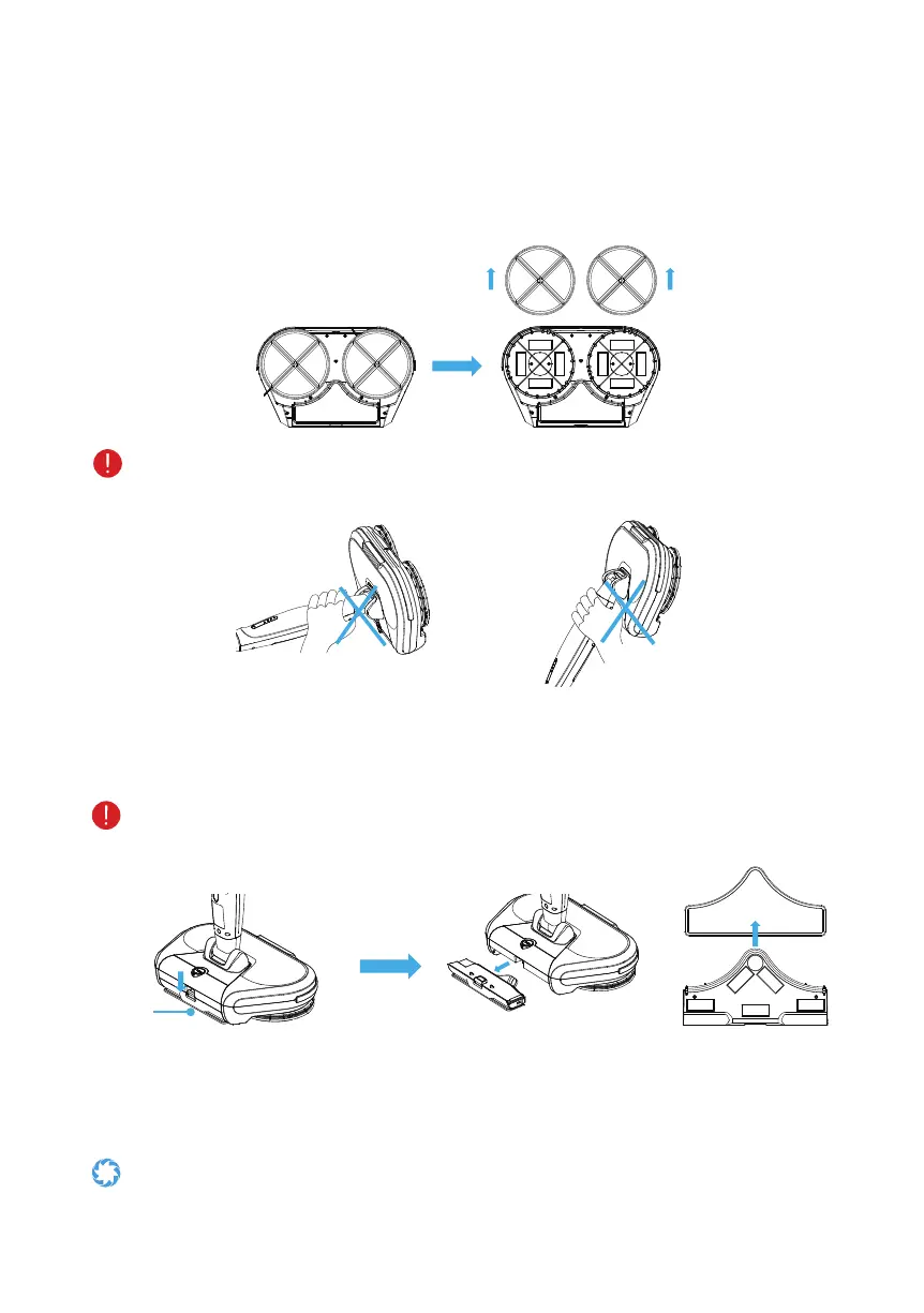 Remove the dustbin before taking off the back mop. The edge of the mop must be