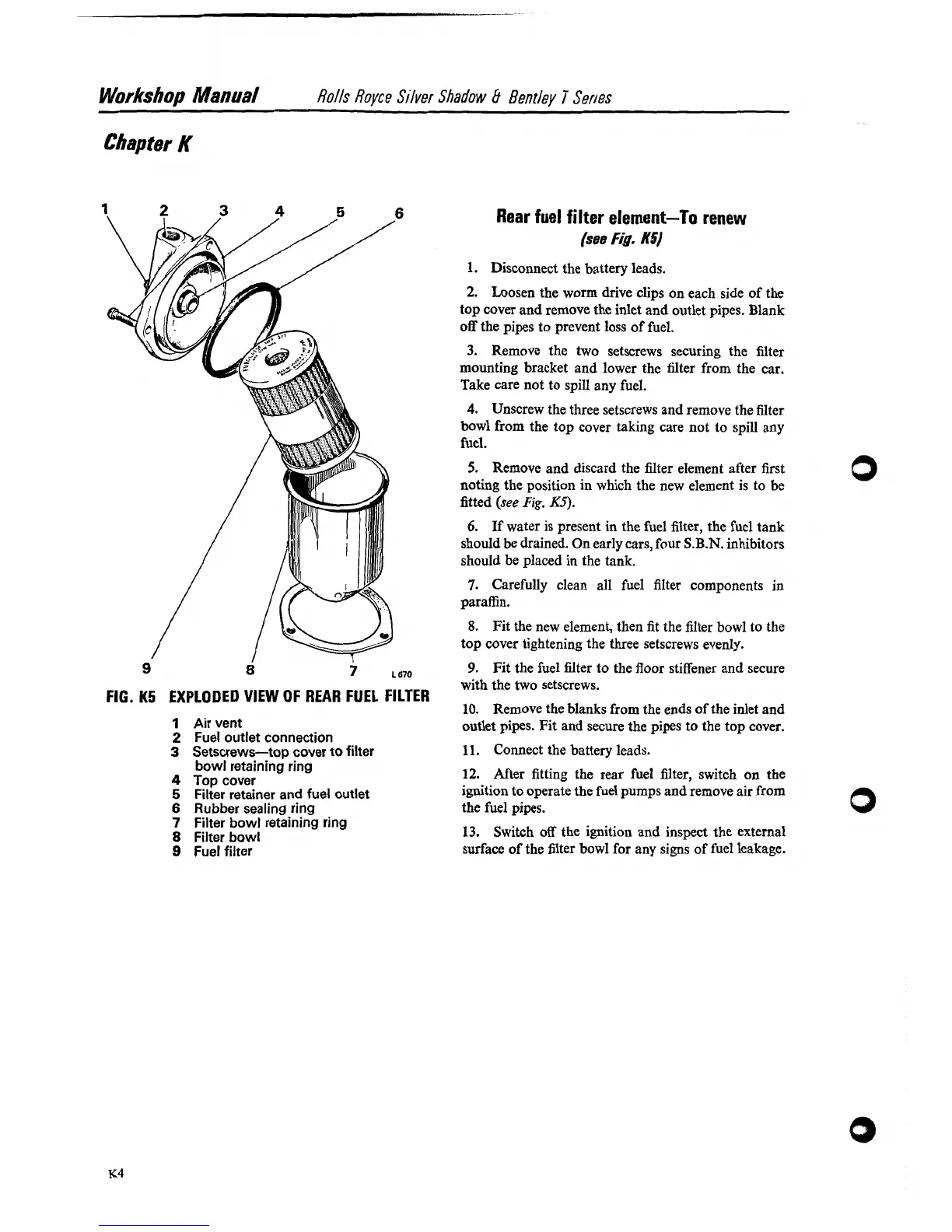 Rolls-Royce Bentley Corniche - Rear Fuel Filter Element-To Renew; Exploded View of Rear Fuel Filter