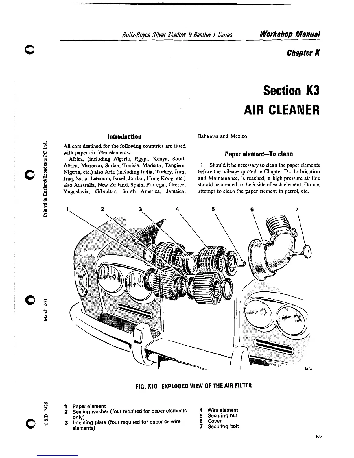 Rolls-Royce Bentley Corniche - Introduction; Paper Element-To Clean; Exploded View of the Air Filter; K 3 Air Cleaner