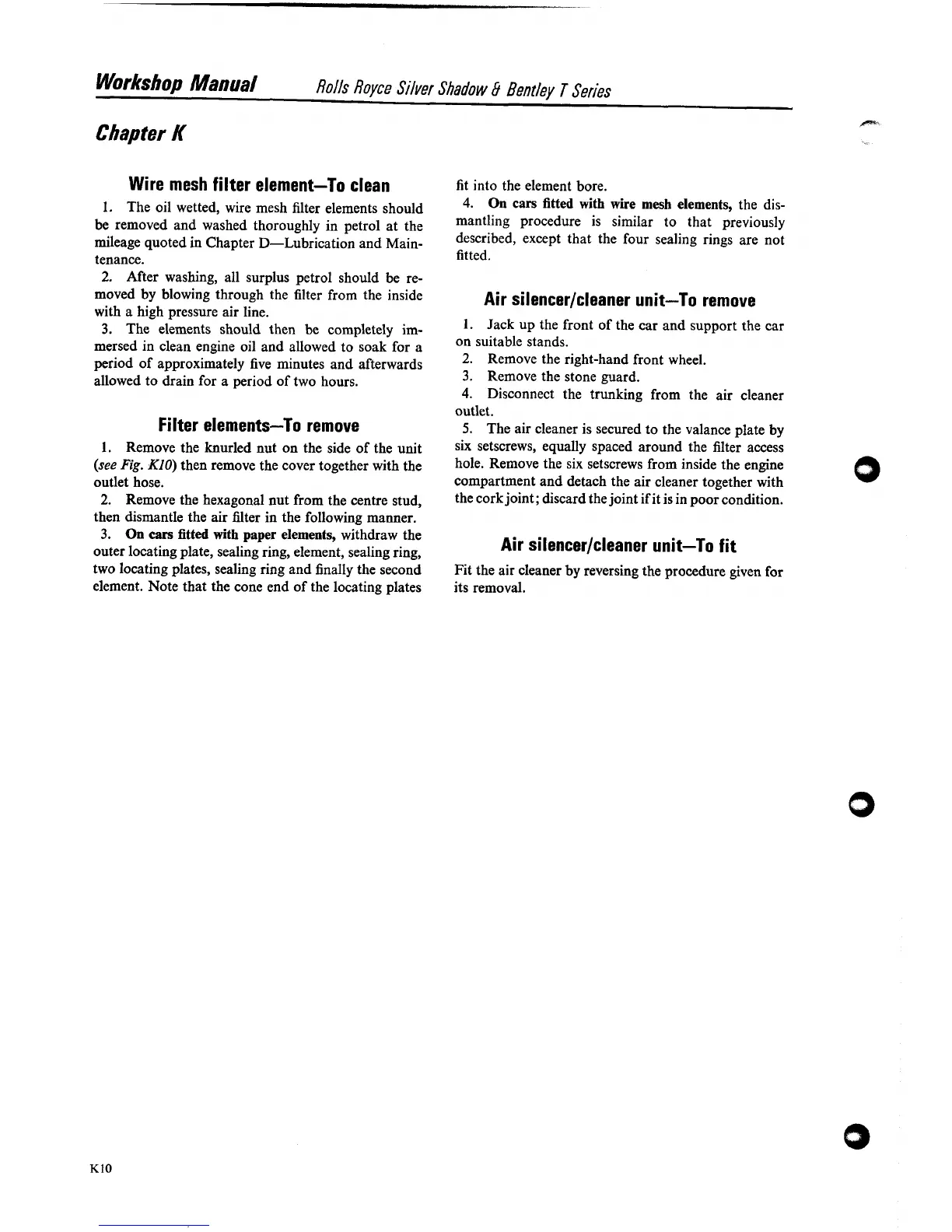 Rolls-Royce Bentley Corniche - Wire Mesh Filter Element-To Clean; Filter Elements-To Remove; Air Silencer;Cleaner Unit-To Remove; Air Silencer;Cleaner Unit-To Fit