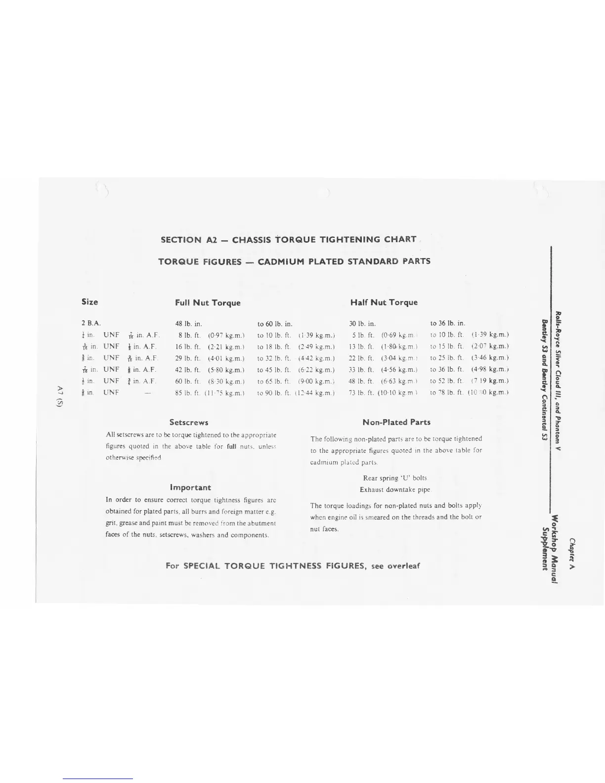 Rolls-Royce Silver Cloud - Section A2 Chassis Torque Tightening Chart