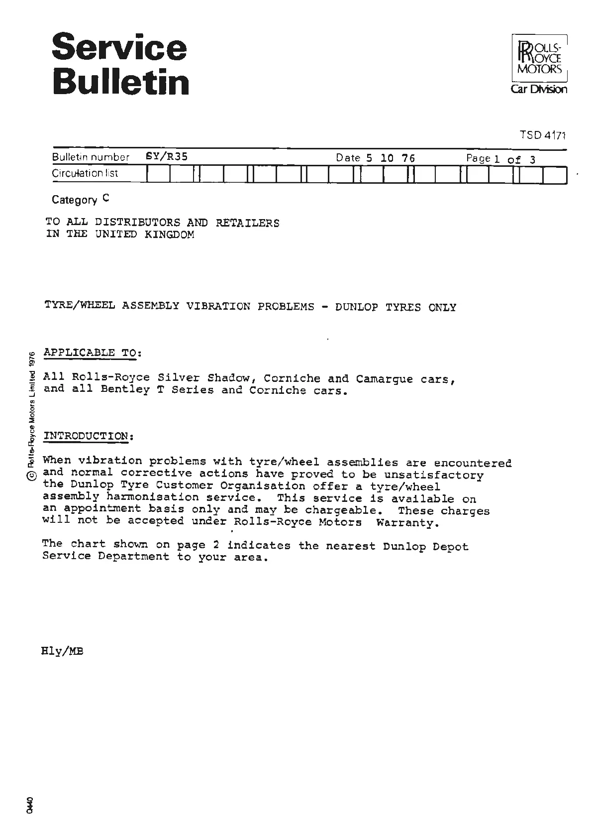 Rolls-Royce Silver Shadow II - Tyre;Wheel Assembly Vibration Problems - Dunlop Tyres Only