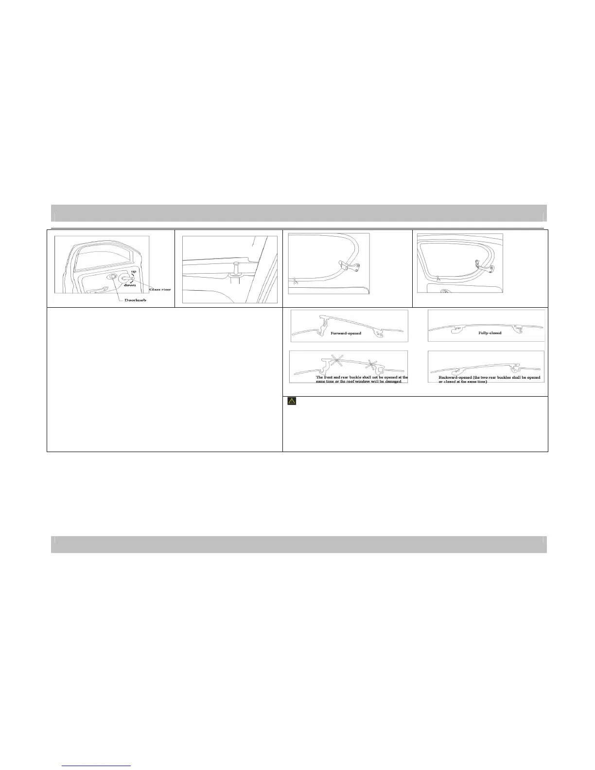 The front and rear buckles shall not be opened at the same time or the roof window will be damaged. Don’t open the roof window immediately after the rain. You can