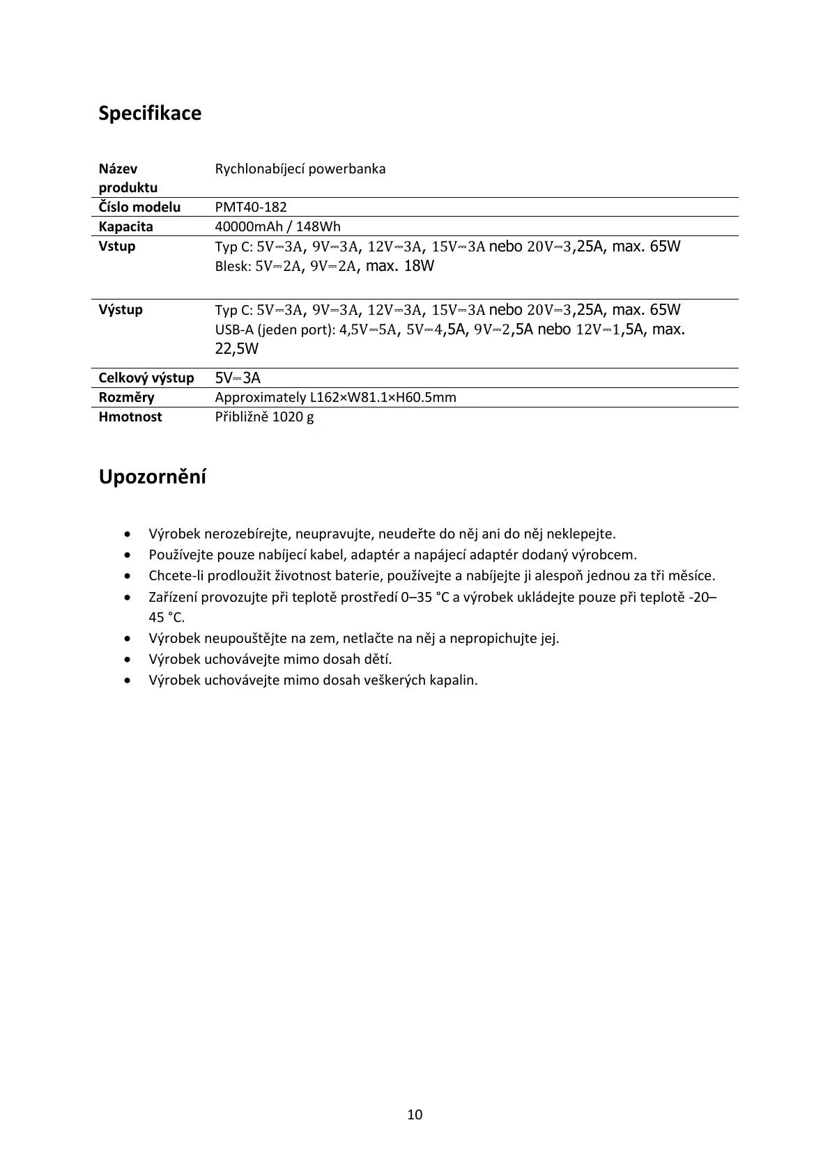 • Zařízení provozujte při teplotě prostředí 0–35 °C a výrobek ukládejte pouze při teplotě -20–